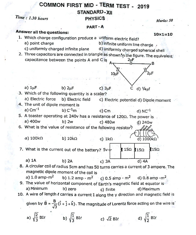 12th Physics First MidTerm Question paper 1 - 2019 English Medium